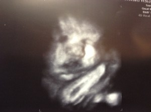One thing that has remained the same before and after El was born is her fascination with her hands. Â In most every ultrasound, she had her hands up by her face – and she has continued this outside the womb. Â Her hands are very important to her and give her much comfort (especially if Mommy’s taking too long preparing for the next feeding – ha!) Â Check out these photos of El’s last ultrasound before she was born and a photo soon after birth…