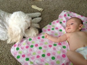 Bax is completely devoted to Elizabeth and seems to understand that he must be gentle with her. Of course he still tries to get in a few licks as he meanders past. 🙂 Fortunately, El’s cries don’t seem to bother him and he makes sure I know she needs attention if I happen to be in another room by coming to find me. What a good big bro!