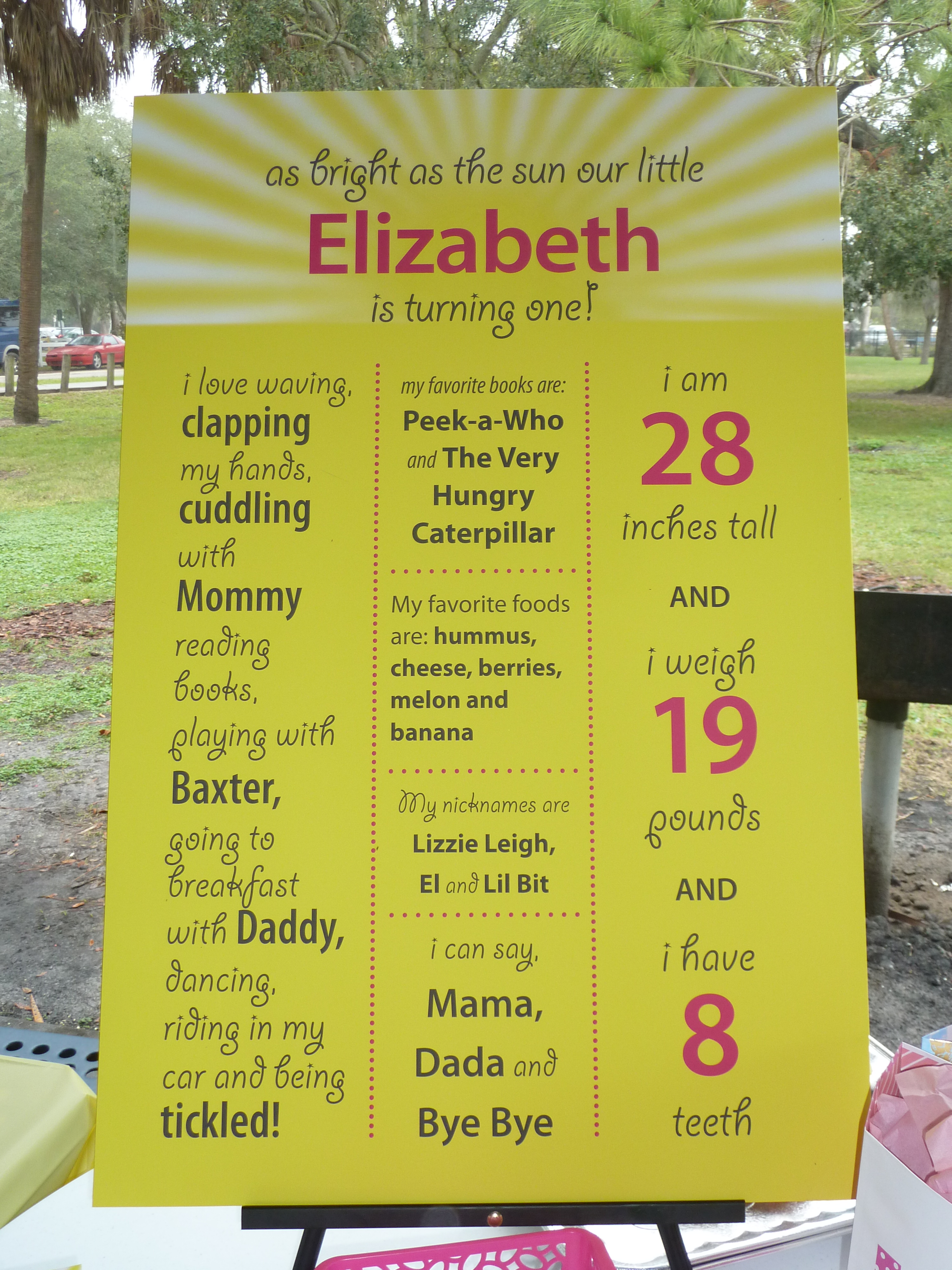 Birthday banner – created by PopsSpecial poster listing all El’s fave things – made by GrampyEl’s 1st bday was my deadline for updating her baby bookGramps also created these cute table tents with pics of El throughout her first year