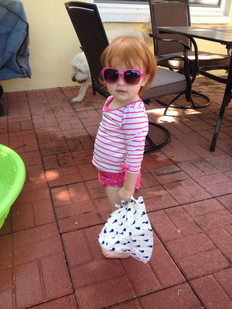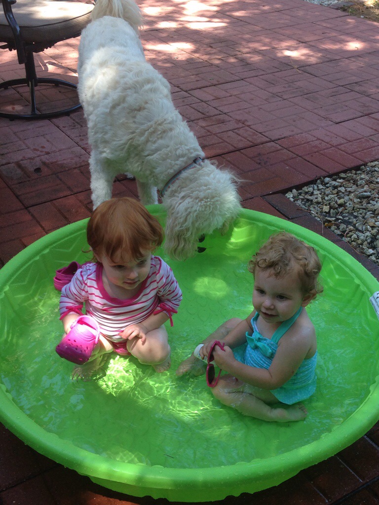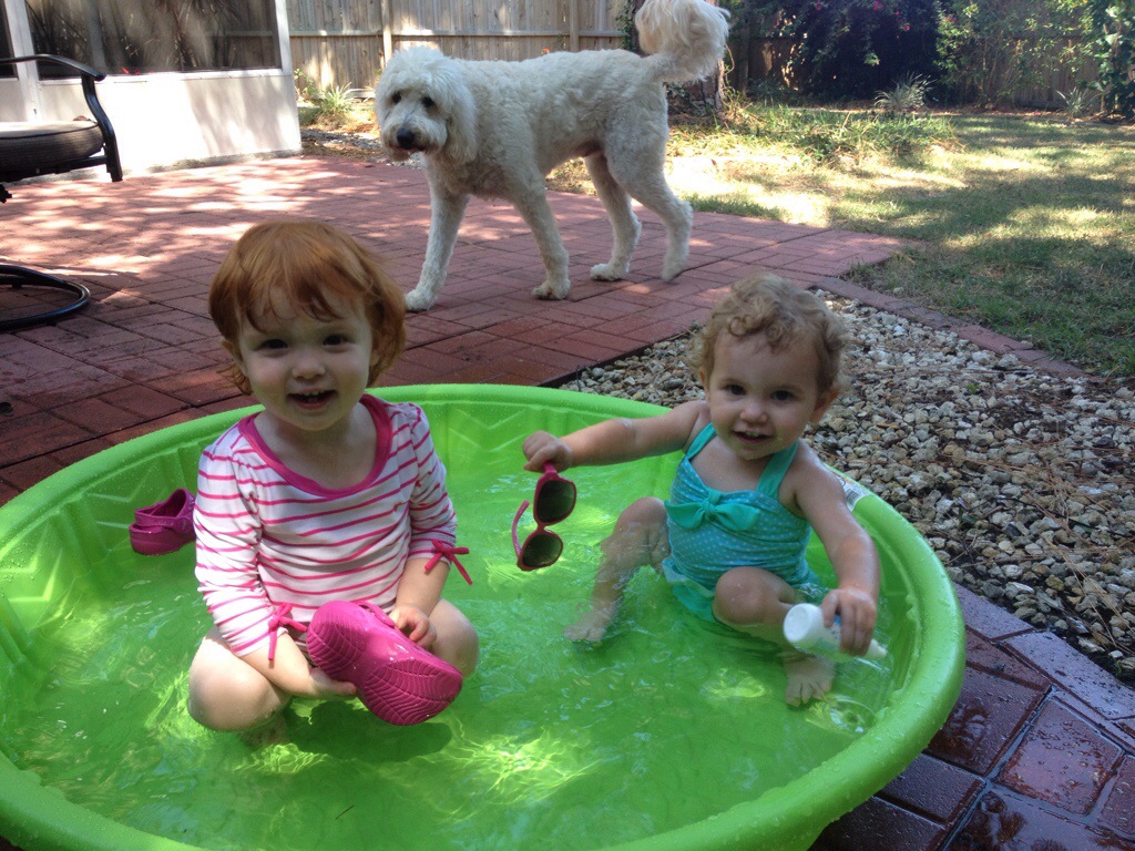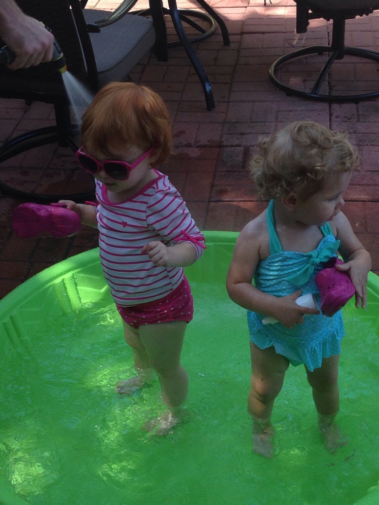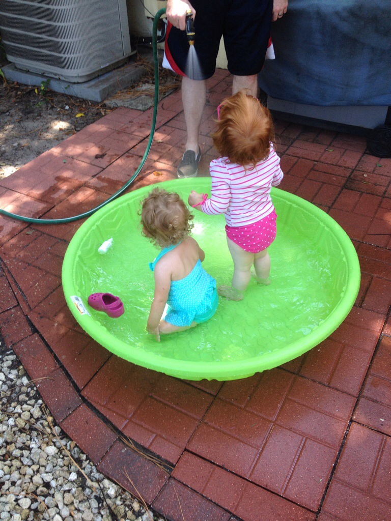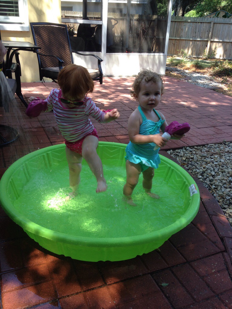 It was great to see the Stack family last weekend. While in Orlando visiting family (all the way from Seattle), they drove over to Tampa for the day for a visit. Emma and Lizzie behaved at lunch and then the real fun began when we got back to the house. We took out the kiddie pool and voila – it was an instant pool party. Could these two be any cuter?? 🙂