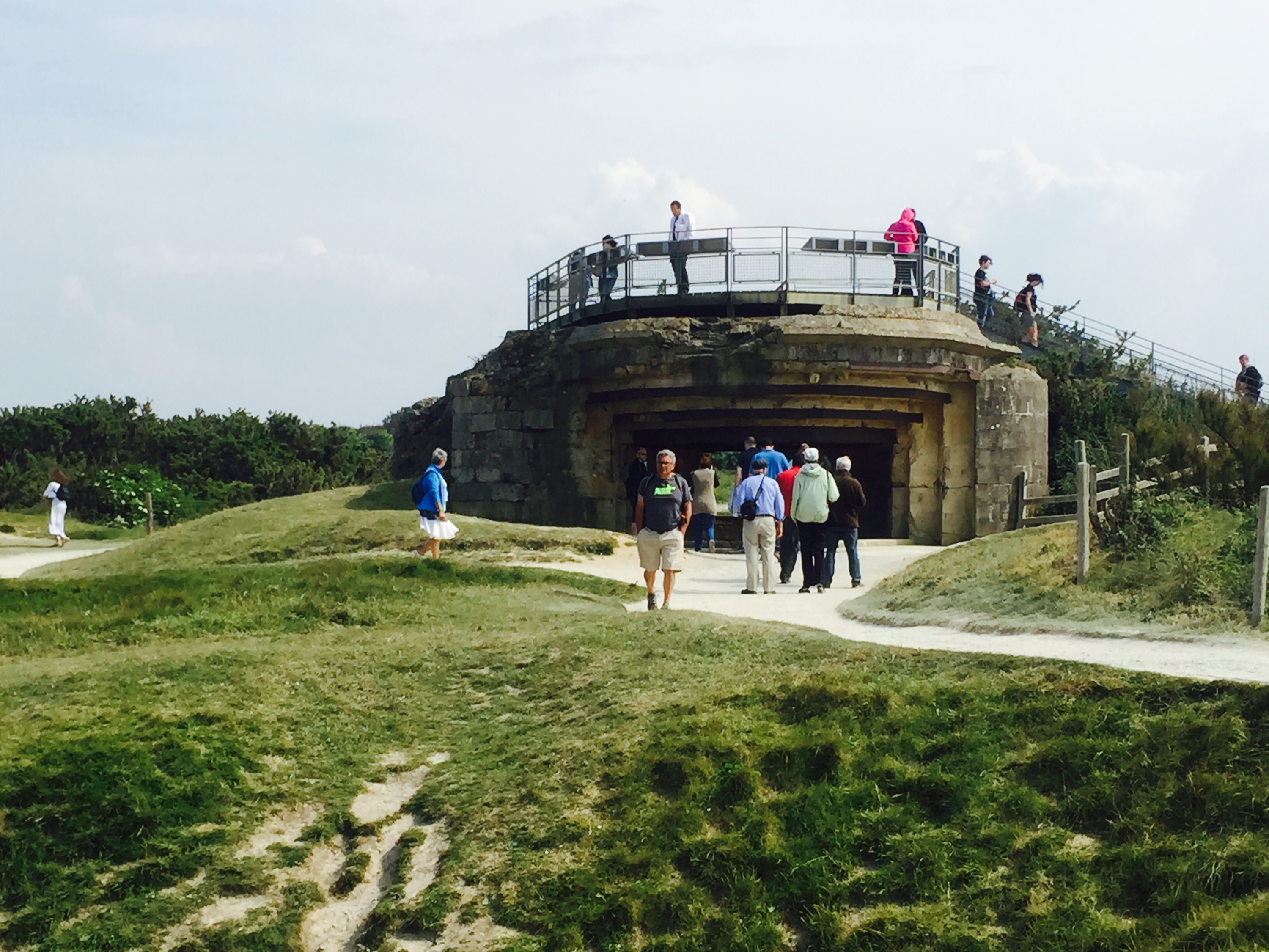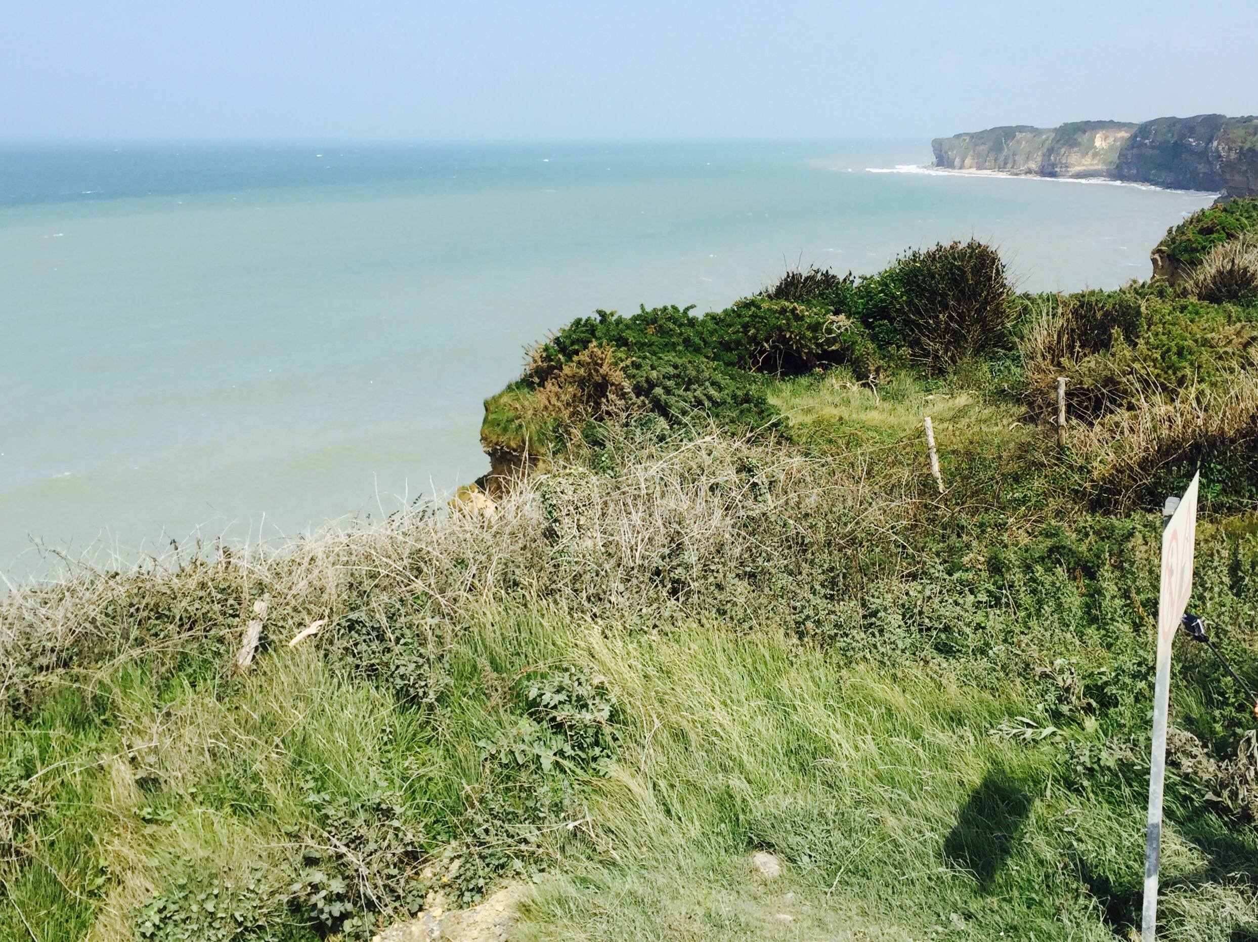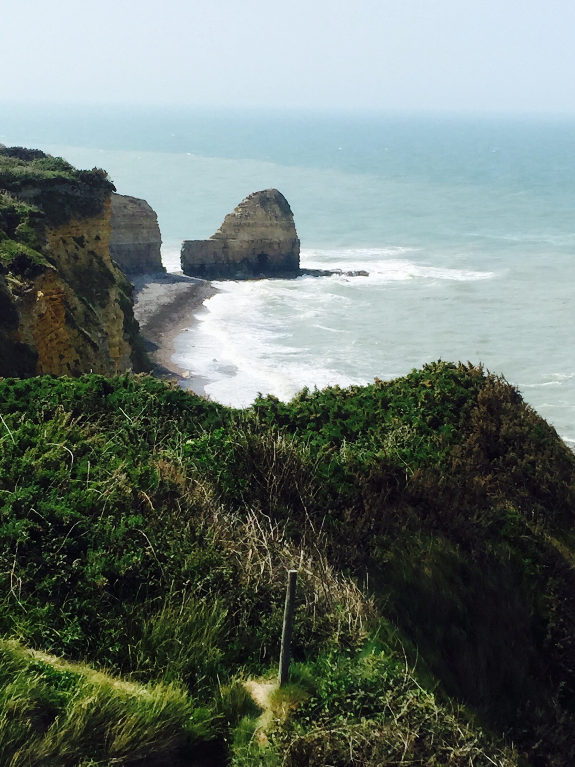 The last stop on our D-Day tour was the famed Pointe Du Hoc, a cliff overlooking the beaches that Army Rangers famously scaled and secured during the invasion. I had never heard of this special mission, but JR and my Dad knew all about it. We started at the small museum to get some background on the endeavor, but most of our time was spent walking through the site. Pointe du Hoc lies 4 miles west of Omaha Beach and was heavily fortified by the Germans. The main issue were the guns housed here – the Germans had 155mm guns that could easily reach Omaha Beach and would threaten the Allied landings on D-Day. The Rangers plan was to land at the bottom of the cliffs before the official D-Day invasion began, scale the cliffs using ropes, ladders, and grapples, and then engage the enemy once they reached the top. Sounds easy (read: crazy!), right?