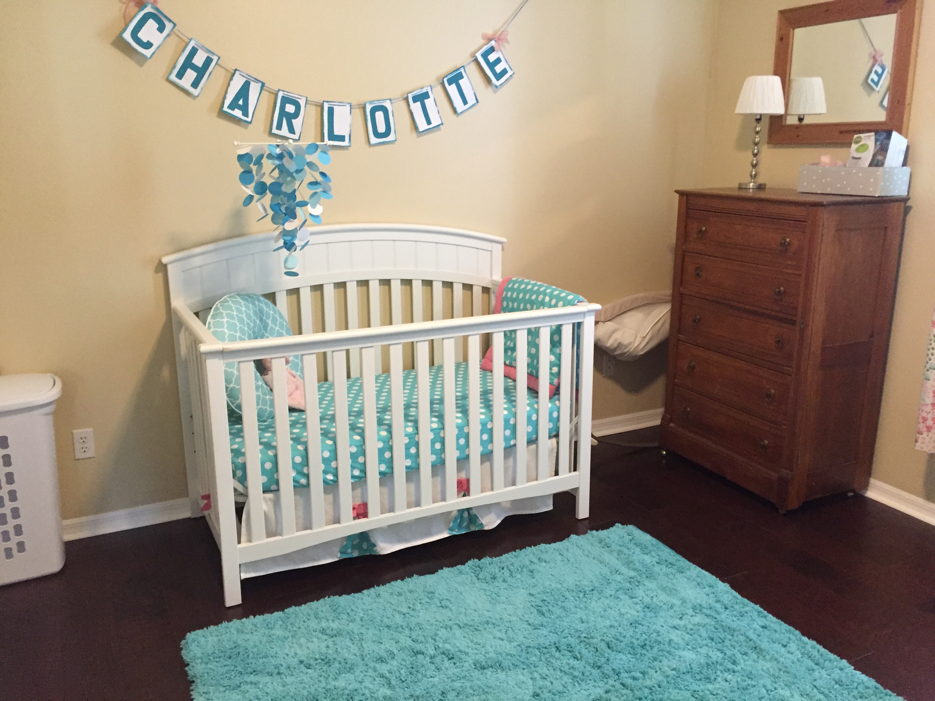 Check out the awesome mobile and name decor hanging over the crib, courtesy of my talented and creative sister! The nursery was finished off with the teal shag rug and curtains I found at Target – the same day I went into labor. I guess Charlotte wanted to wait to make her debut till every detail of her nursery was finalized. 😉