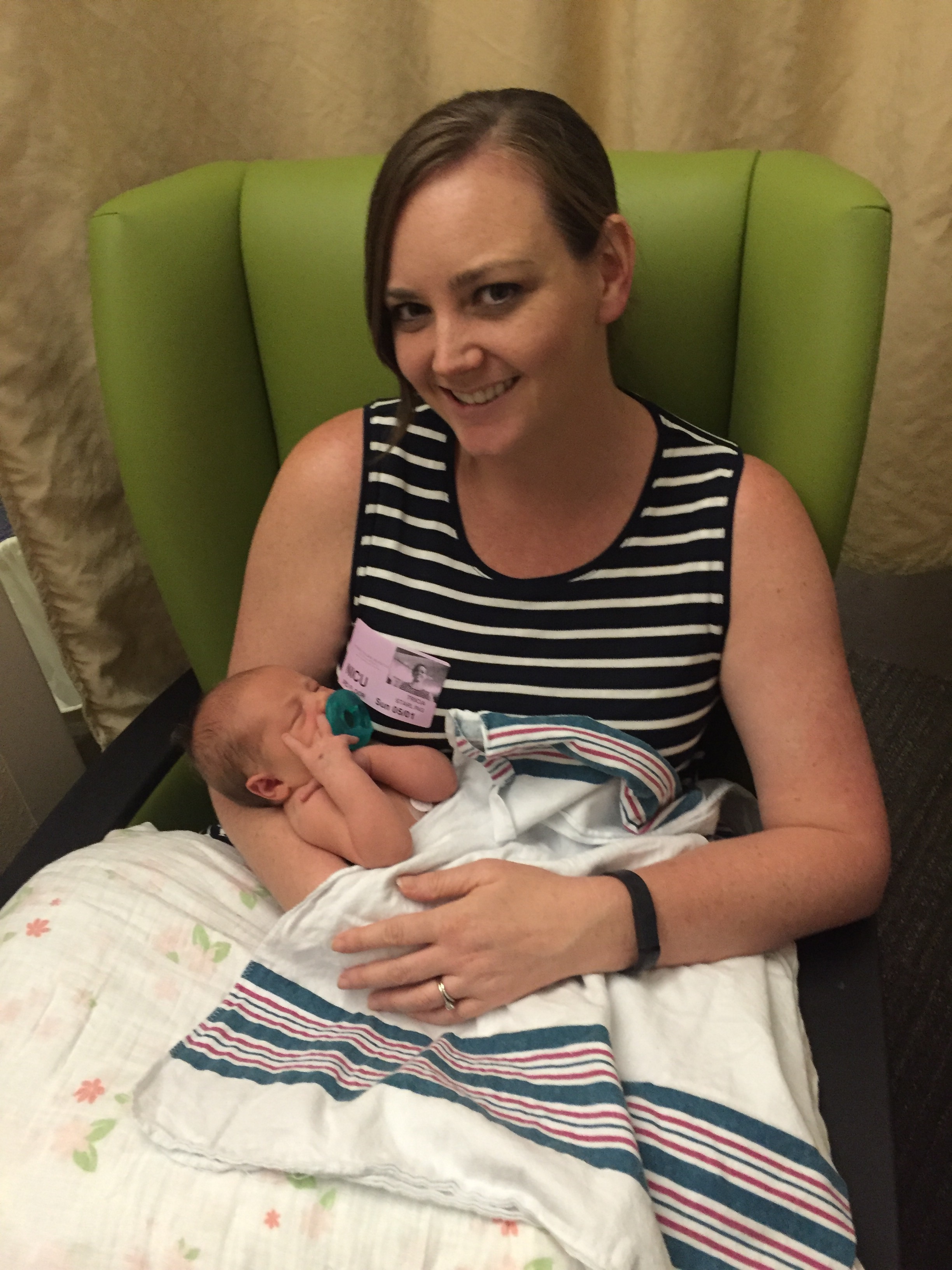 After a few days of constant monitoring, lots of testing (brain MRI, EKG, echocardiogram, and more) and very few drops in Charlotte’s oxygen levels, the NICU pediatrician decided she could be moved to a lower-level NICU pod. This was a relief. This pod was much quieter because the babies were much less sick. Charlotte was still one of the largest, but there weren’t constant alarms and she only shared a room with one other baby. Also, the NICU nurses here were less like drill sergeants and seemed to have more sympathy for the parent’s plight too. The best news of all…I could hold Charlotte more often and try to breastfeed again (versus feeding her pumped milk through a feeding tube).