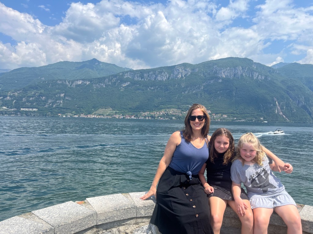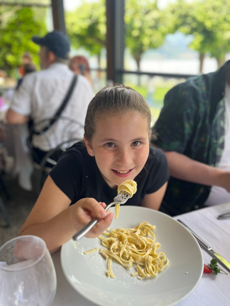Thursday – after a good night’s sleep – we explored the town, enjoyed our first Italian appetitive and first bowl of pasta, and let the girls test out the cool waters of Lake Como.