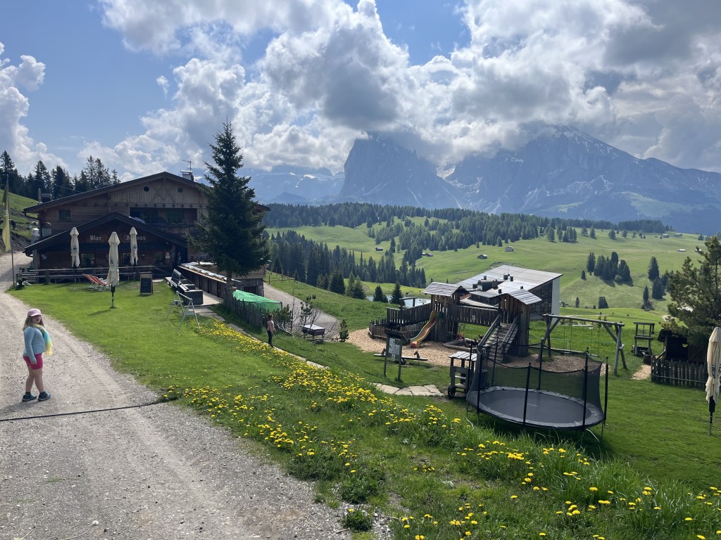 Our first stop was only 20 minutes in…we visited a local hut with its own farm animals and a playground for kids. Many of the huts that dot the Alpe di Siusi are like this, with self-sustaining gardens and farms to supply fresh meals for weary hikers. We stopped to order coffees and a light breakfast while the girls explored the play area and met the animals.