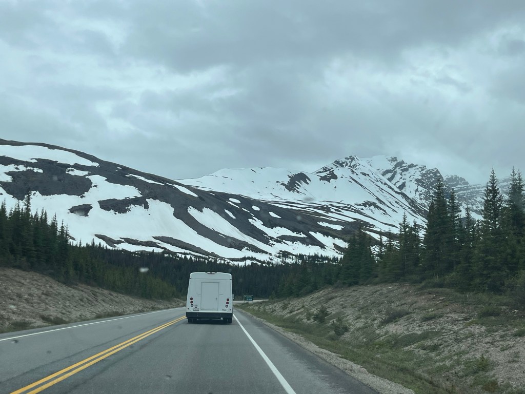 The Icefields Parkway is the main road in and out of Jasper National Park. It’s a beautiful road winding in and out of wooded mountain areas, then rising up into glacier country. At its highest point is the Columbia Icefield, the largest icefield in North America’s Rocky Mountains.