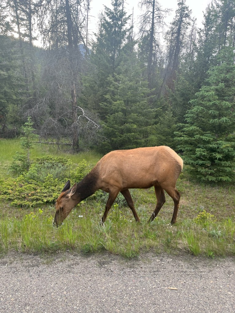 Back on the road to Jasper for dinner, we kept our eyes peeled for wildlife. And this time we were lucky – we saw a giant Golden Eagle and its nest right by Medicine Lake and a lone elk grazing by the road.