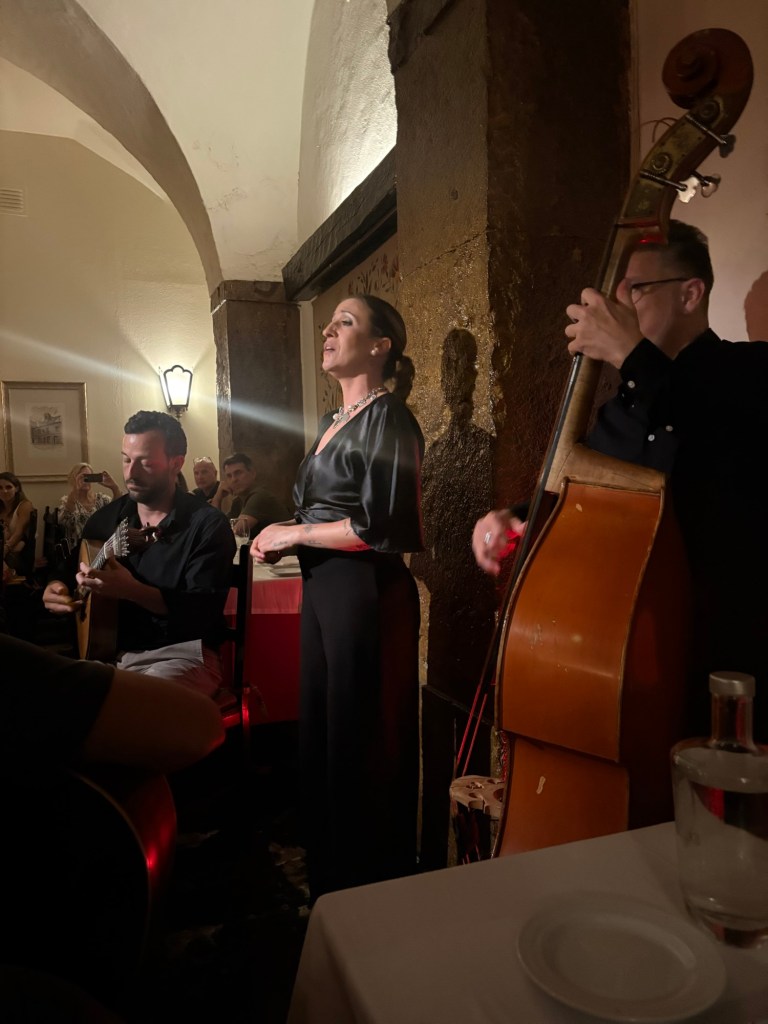 Fado is traditional Portuguese music characterized by its melancholic and expressive melodies, often associated with themes of love, loss and the sea. Our fado show featured three different singers, all unique in their styles (two women and one man). It was quite beautiful. Even though it was in a different language, you could feel the emotion in the singers voices. I’m so glad we shared in this experience and would definitely go to another show.